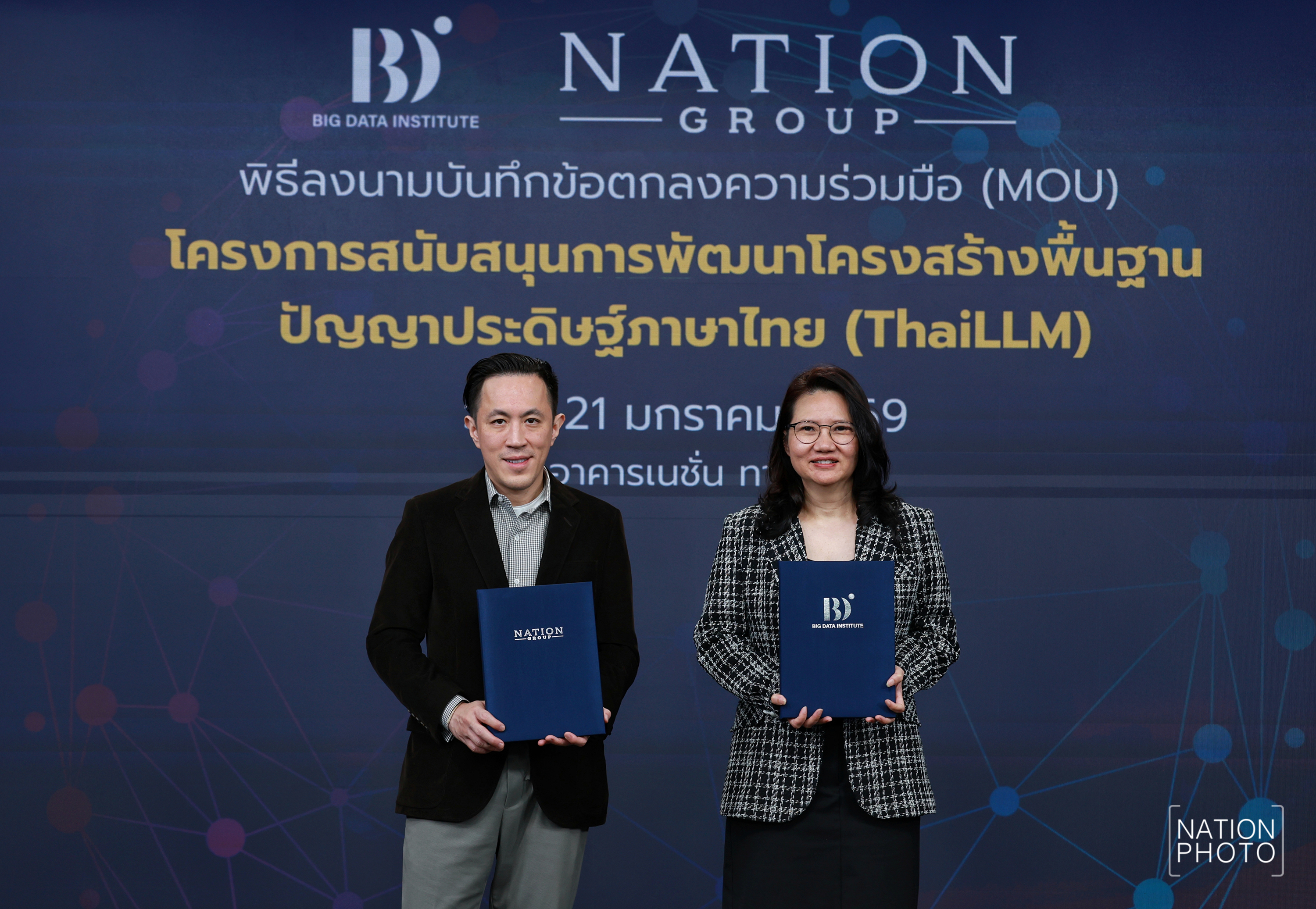บริษัท เนชั่น กรุ๊ป (ไทยแลนด์) จำกัด (มหาชน) และ สถาบันข้อมูลขนาดใหญ่ (องค์การมหาชน) หรือ BDI ร่วมลงนามบันทึกข้อตกลงความร่วมมือ (MOU) เพื่อสนับสนุนการพัฒนาโครงสร้างพื้นฐานปัญญาประดิษฐ์สำหรับภาษาไทย (ThaiLLM) มุ่งยกระดับการพัฒนาโมเดลภาษา AI ที่เข้าใจบริบทภาษา สังคม วัฒนธรรม และโครงสร้างข้อมูลของประเทศไทยอย่างแท้จริง พิธีลงนามจัดขึ้น ณ อาคารเนชั่น เมื่อวันที่ 21 มกราคมที่ผ่านมา